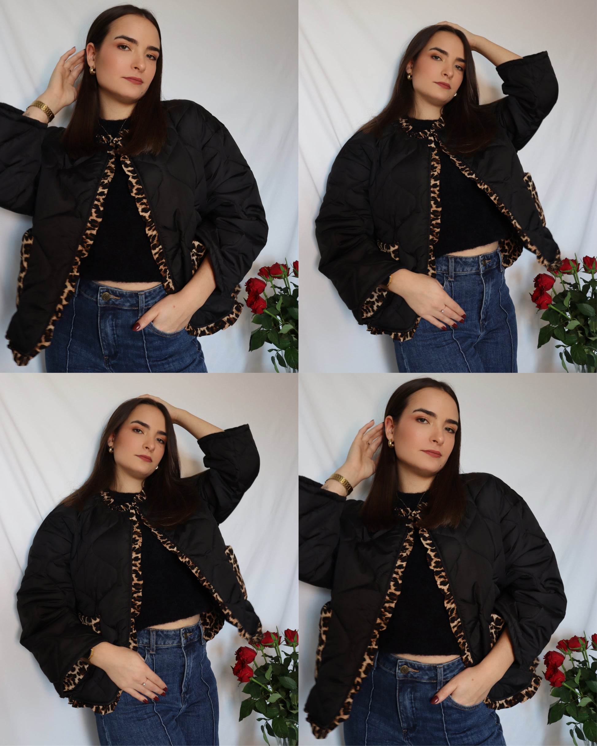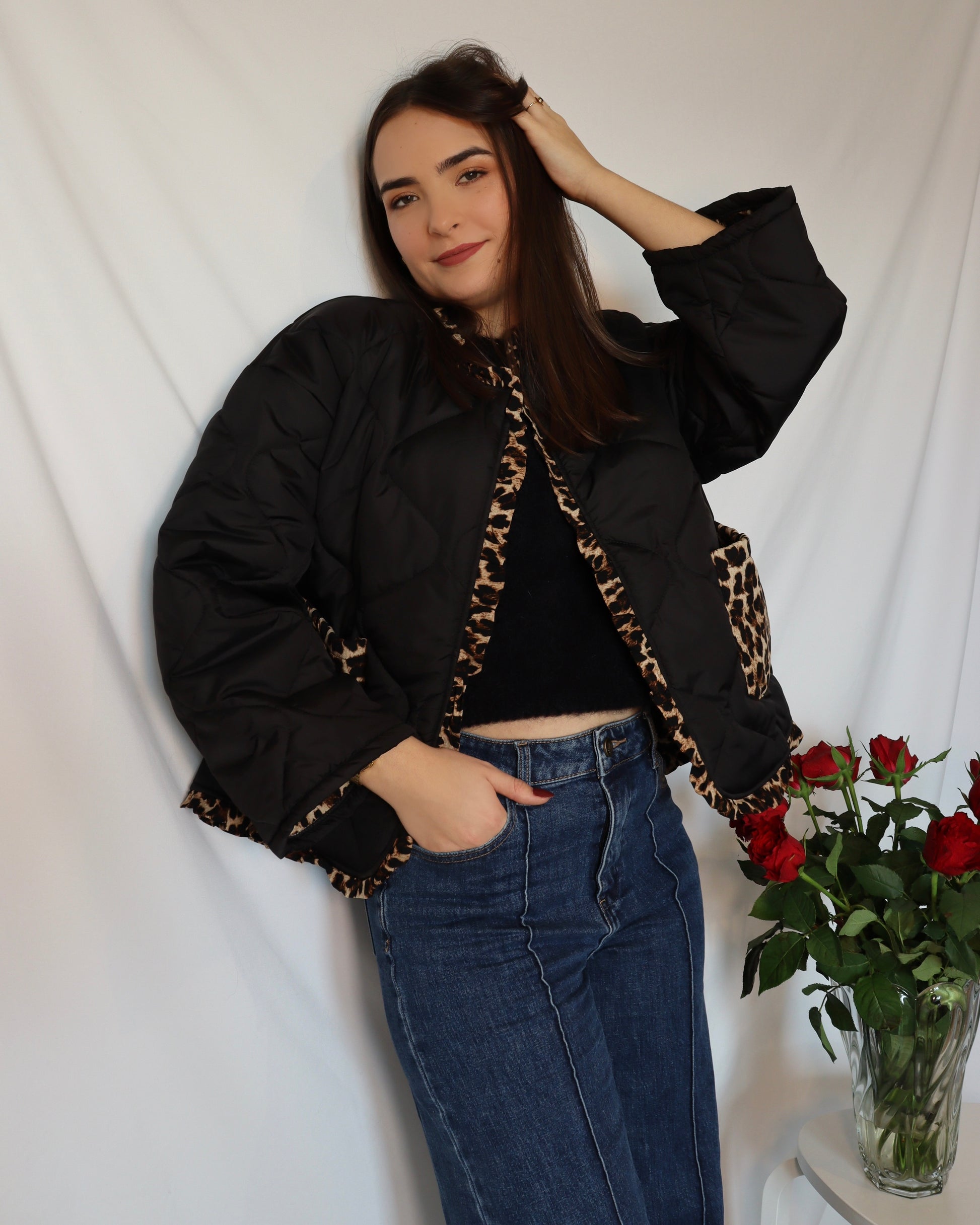 Cette veste ouverte matelassée à manches longues, avec ses bordures léopard et sa doublure à motif léopard, allie confort et audace.