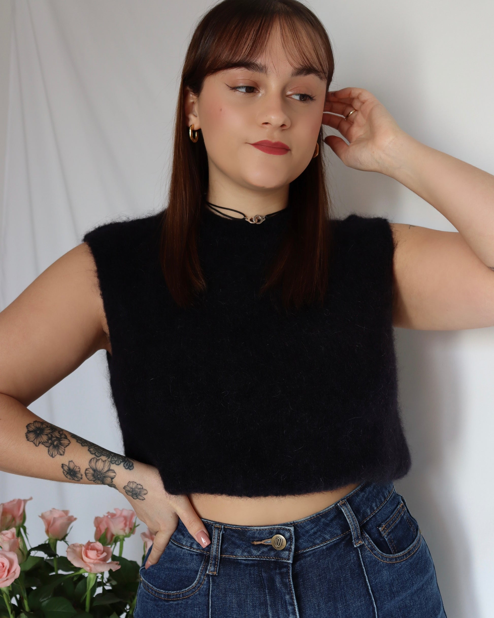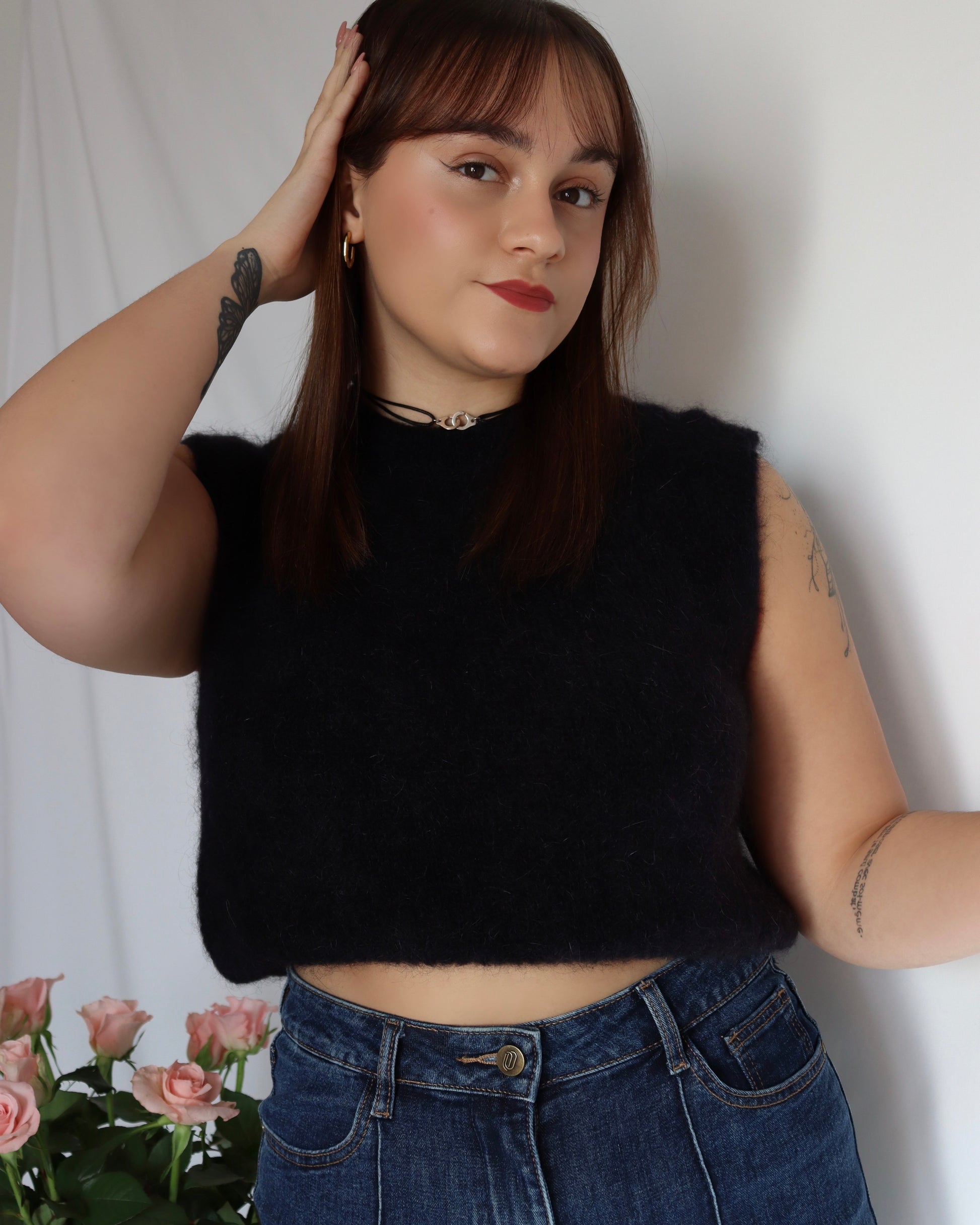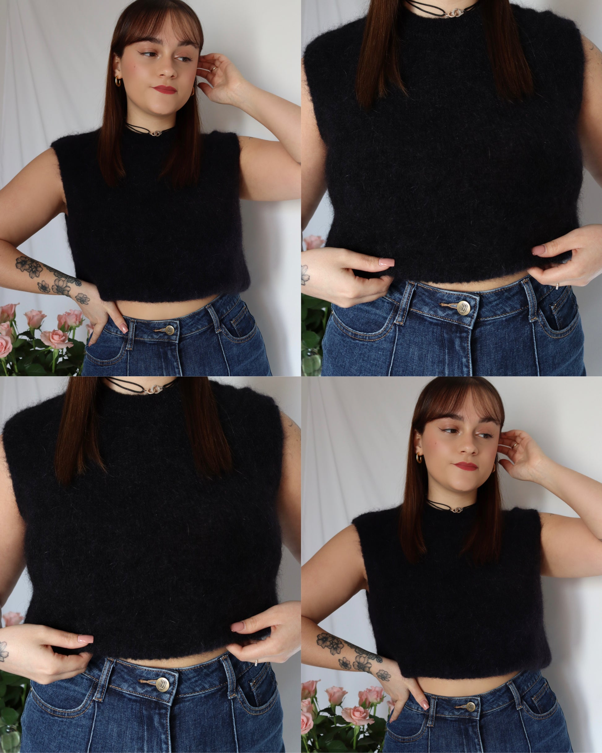 Ce top en maille sans manches noir, avec sa coupe minimaliste et son col rond, est une pièce incontournable qui apporte une touche d’élégance décontractée à ton dressing.